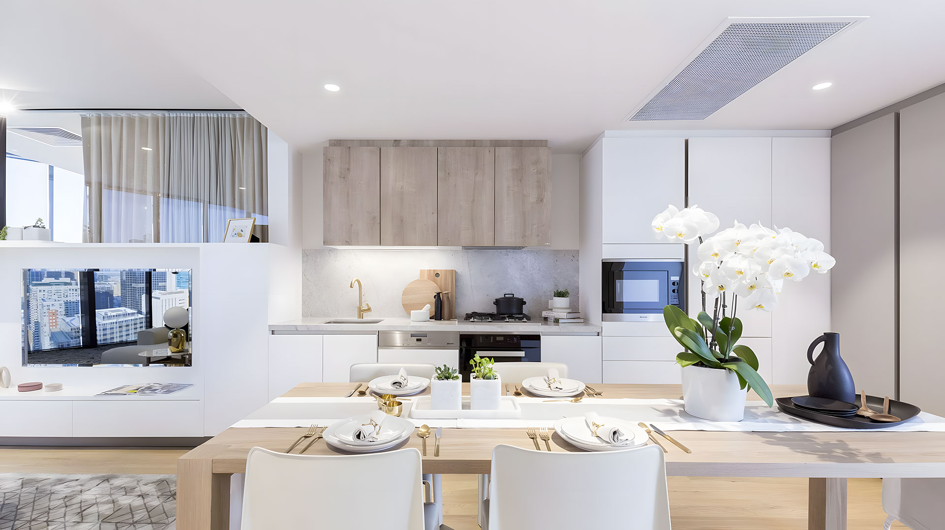 廚房選用SieMatic PURE系列,運(yùn)用啞光烤漆和木紋元素之間的對(duì)比創(chuàng)造了一個(gè)素雅,自然而富有現(xiàn)代感的室內(nèi)設(shè)計(jì),充滿了精致的視覺(jué)效果。