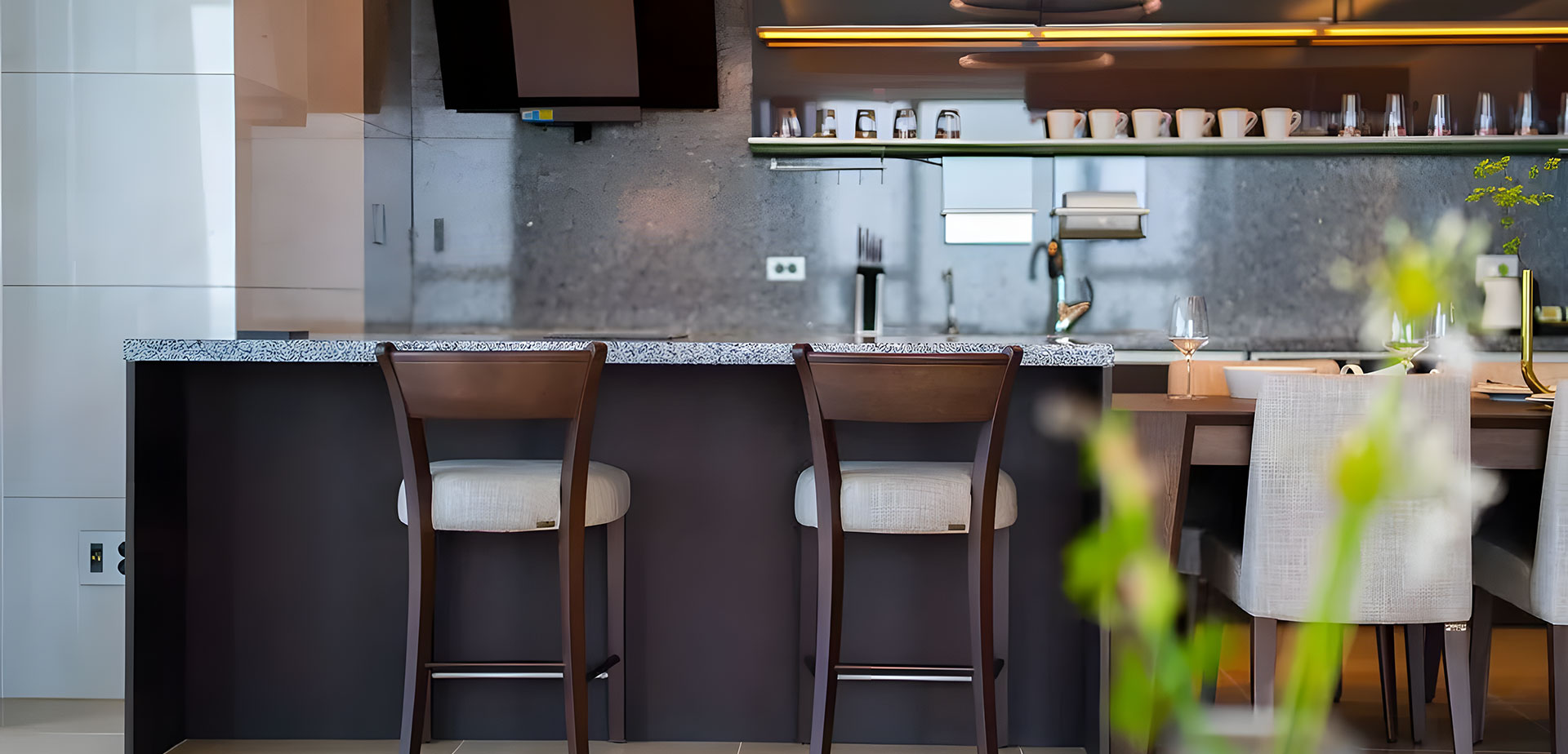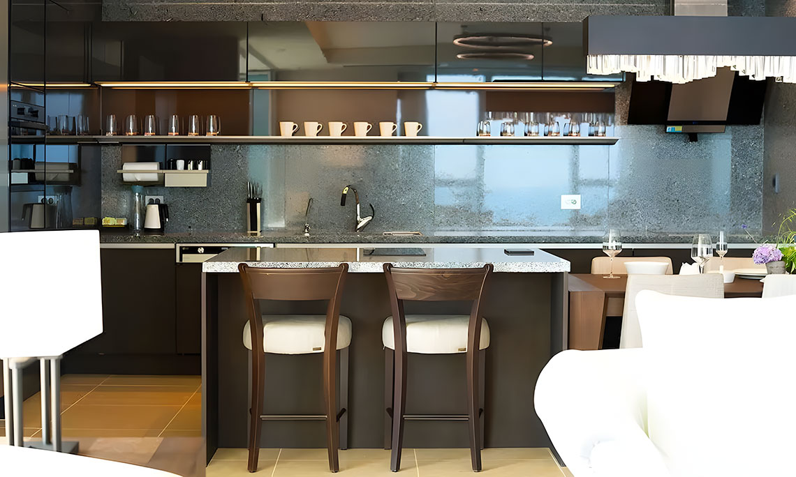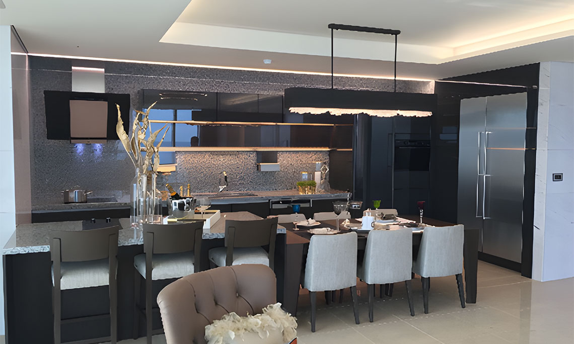 木飾面、高光烤漆、玻璃的交疊,賦予了空間更飽滿的視覺層次;中島臺的設計,升華了空間的輕奢格調;簡致的設計,傳達出精致奢華的現(xiàn)代廚房理念。