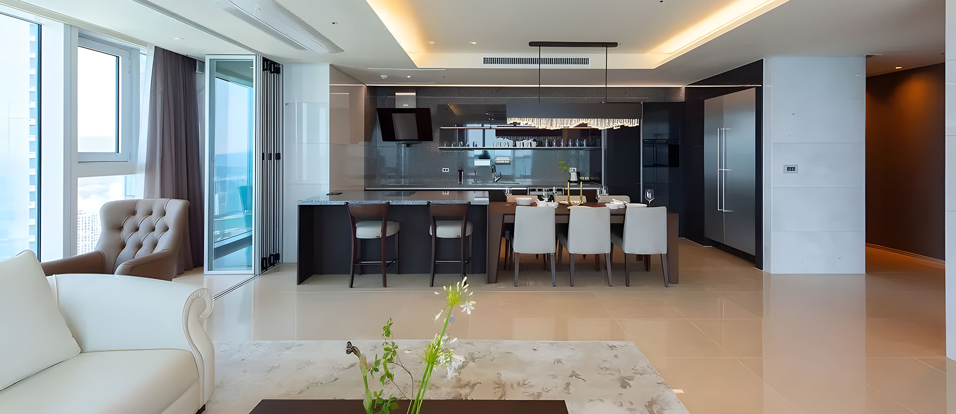 韓國釜山LCT綜合體項目內的廚房選用SieMatic PURE系列,白色的餐廚空間讓人百看不厭,給人一種純凈無暇的輕奢之感,原木色的桌椅搭配,既保持了整個空間的清新素雅又不失活力的本色。