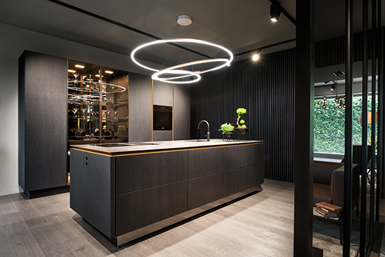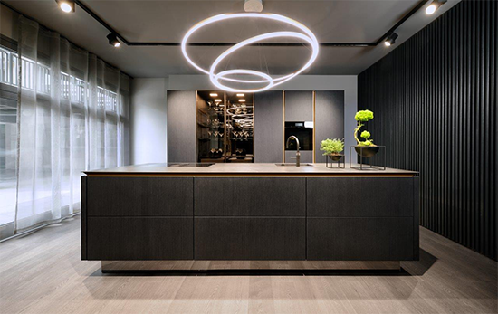 門板斜切角上沿的寬度、超薄臺面的厚度、側貼裝飾板的厚度,甚至和光線倒影出來的跨度都是驚人的6.5mm。視覺上完美協調的統一絕非偶然,而是來自于SieMatic強大的設計體系的支持和對工藝近乎苛刻的要求。