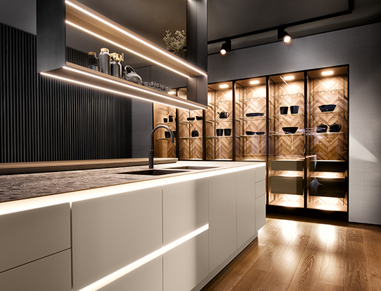 SieMatic SLX PURE系列所具有的令人難以置信的輕盈體現在豪華的玻璃柜中,抽屜裝置直接固定在后背板上,看起來似乎漂浮在空間中。透明玻璃門和側面板以及可調節的玻璃隔板,使得廚房和生活區融為一個和諧的整體。精致的鋁制框架采用陽極氧化成啞光黑色,金銅色或不銹鋼色,再加上靈動的燈光元素,使之成為整個房間的皇冠上的寶石。